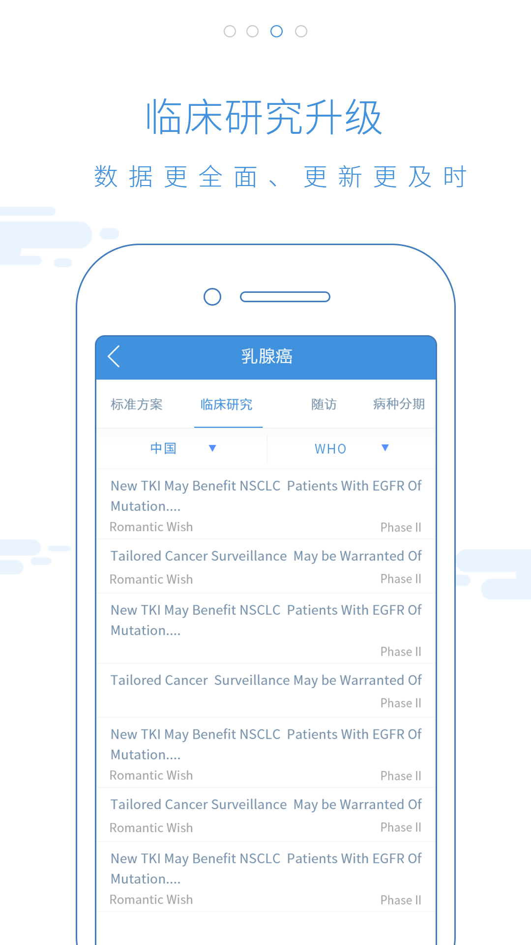 肿瘤化疗助手 种类齐全的临床研究,全新的用药方案、完备的专业工具、便捷的肿瘤医患交流随访,为您和您的患者提供专业支持。